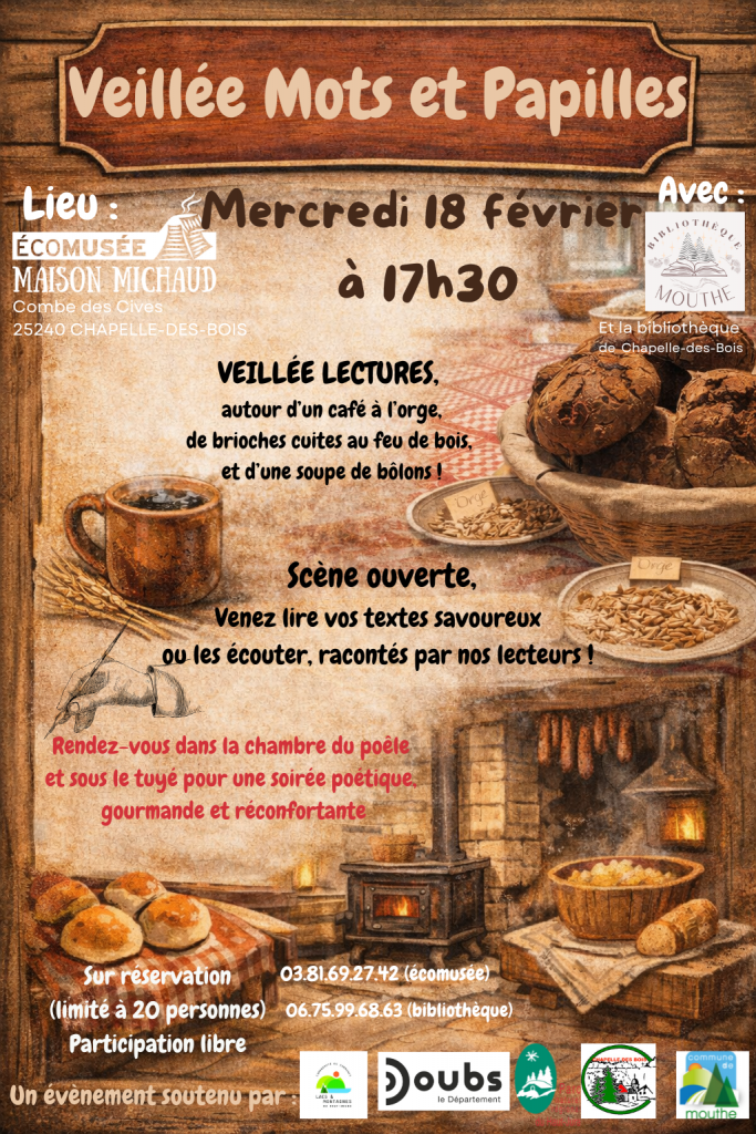 En partenariat avec les bibliothèques de Mouthe et de Chapelle-des-Bois, nous vous convions à une veillée en lectures autour d'un café l'orge, de brioches cuites au four à bois et enfin la dégustation d'une soupe de bôlons !
